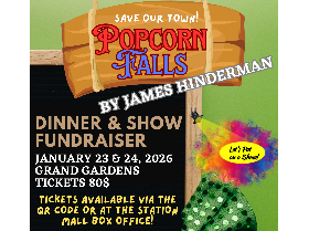 Popcorn FallsGrand Gardens North Popcorn Falls, dramatic comedy. The small town of Popcorn Falls forced into bankruptcy in a world of farce, love and desperation, proving that art can save the world. Two actors play over 20 rolls.