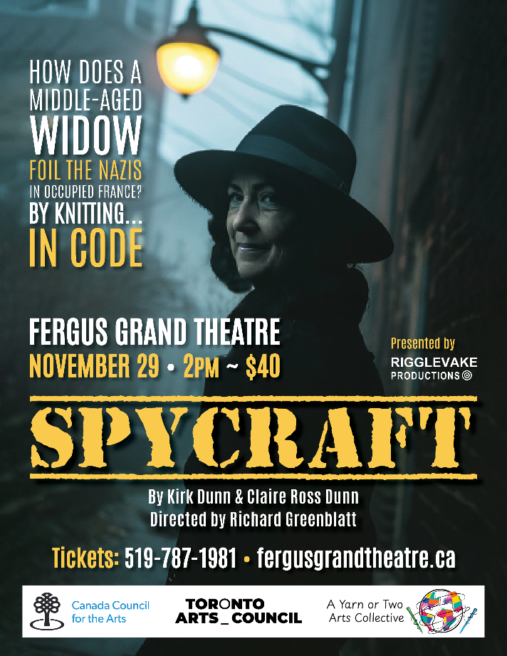 Spycraft is a two-act thriller in the tradition of The Imitation Game, Bletchley Park, and Operation Mincemeat. It’s 1942 and a middle-aged Canadian woman and hidden Jew joins Churchill’s Special Operations Executive in London during WWII as a spy in Occupied France. Her British male colleague is skeptical she’ll make a difference because she’s a woman—and an ‘old’ one at that. But she defies expectations and challenges the chauvinism and ageism of the times by using her invisibility as an asset, and employing a classically female craft to pass coded intelligence about the Nazis back to the Allies: knitting.